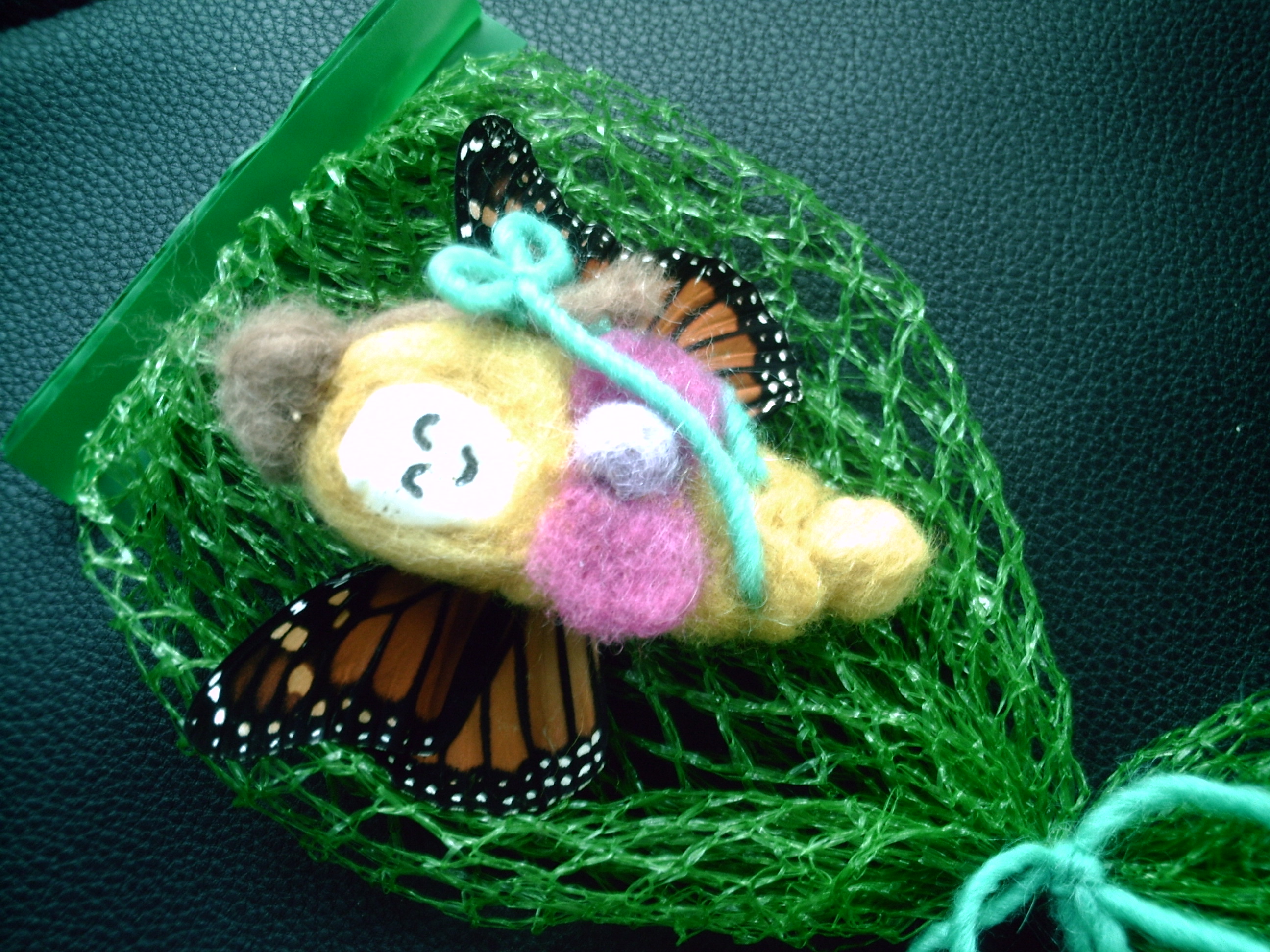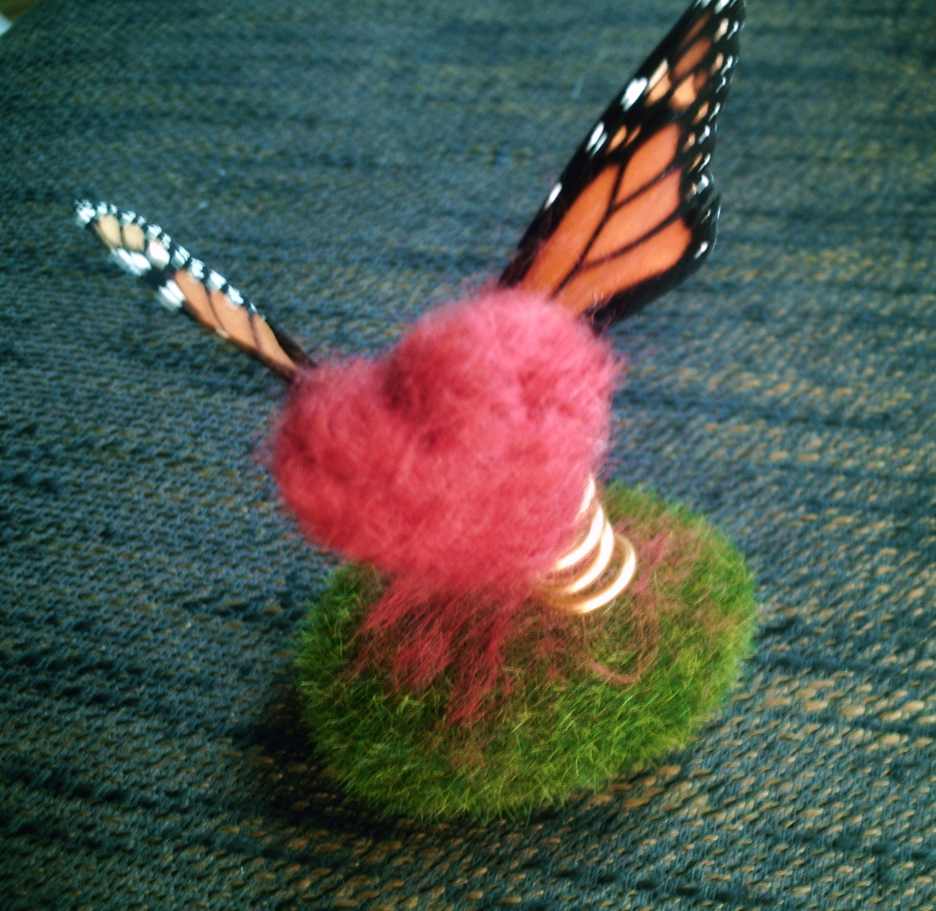 Since I discovered needle felting, I have been hooked. I admire the artists who transform a ball of wool into something, with the only instrument of a needle. To me, this was very interesting as I could not understand, at the beginning, how you could get the wool to behave as you wished by just poking it. If you have touched raw wool you know that it is hard to shape, especially the very soft kind, which unravels in your fingers. Once intrigued enough, I had to find out. I did and I love it. I have created a few needle felting critters, which I call Woodland Magical Critters. My last one was a baby butterfly fairy, called Tinselfly. Here is a picture of her.
