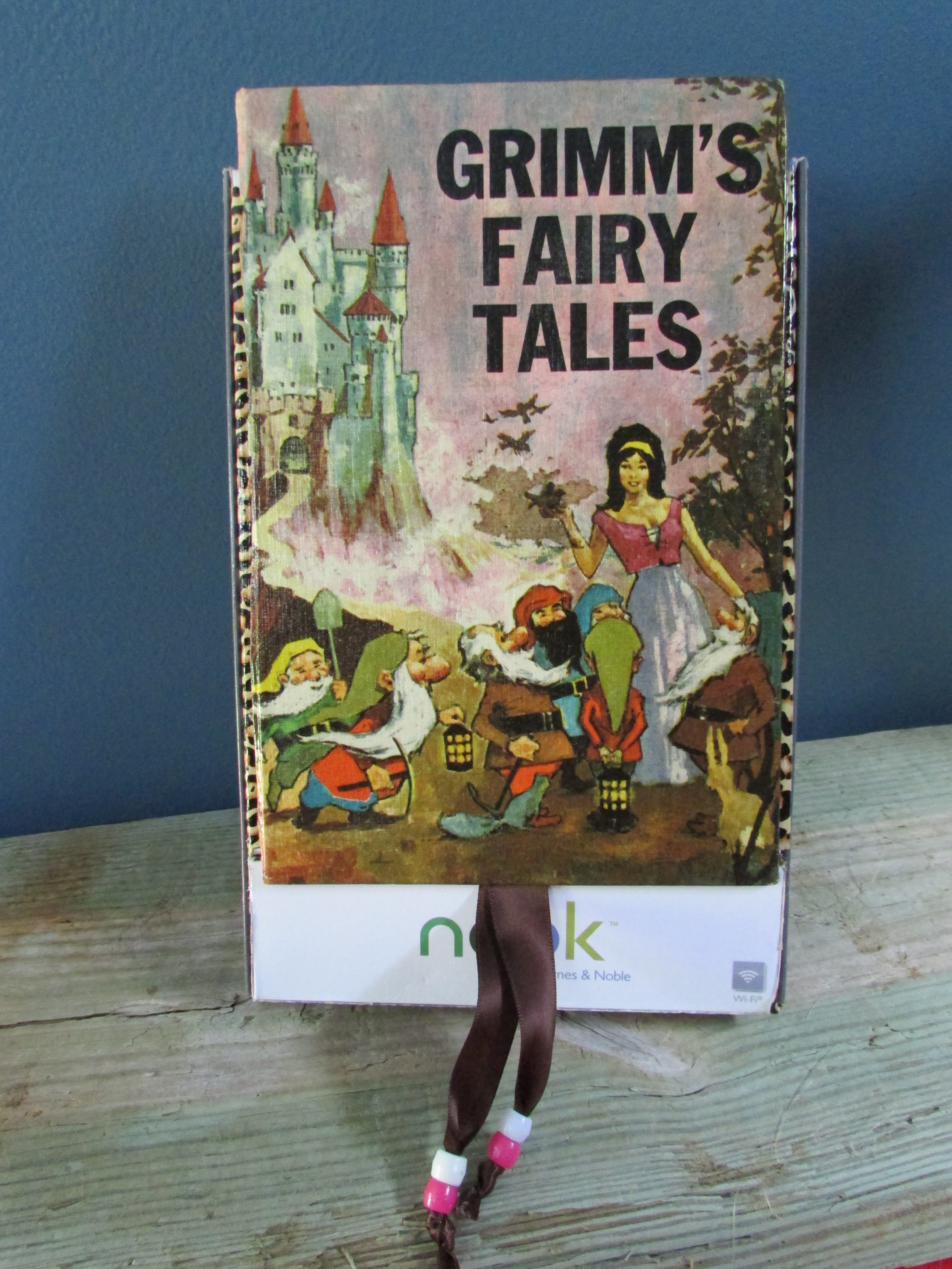 I covered part of the inside with decorative tape (leopard), and part of the outside as well.  Then I took ribbon and beads and fastened them using the same tape so I could open the box by pulling it for the two sections – the nook and the charge cord.  After that, I took a vintage copy of The Grimm’s Fairy Tales, and removed the covers. I attached them, front and back, and glued/glazed the thing with Mod Podge to make it strong and durable (It hardens and protects). This is the result, and I am happy with it. If you have visited this blog, you know that I try the green solution first.