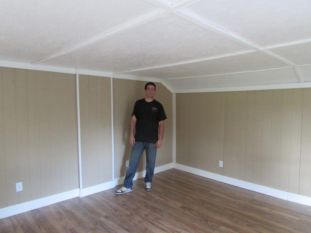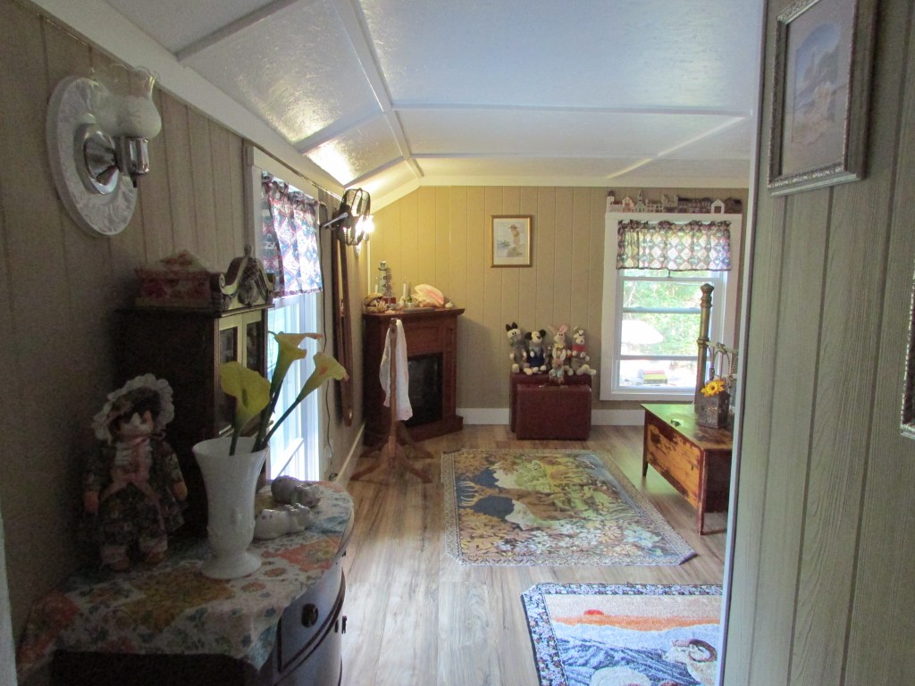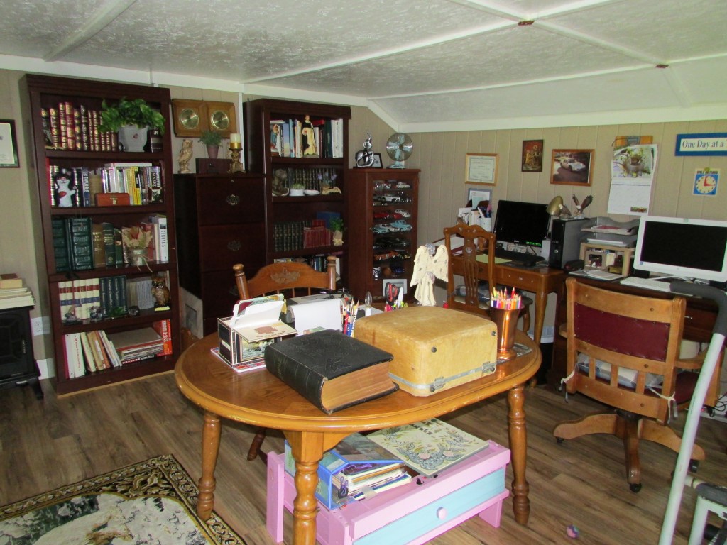 The ceiling in this room is lower than the ceiling downstairs, something that made installation a bit easier for us. I found this room challenging in the sense of the difficulty of bringing material upstairs. In fact, we had to make an opening through the kitchen wall to be able to bring panels, wood, flooring, and long pieces of wood because the stairway was difficult to navigate at its angle, and many things would not go through. The steep incline and the narrow steps presented a challenge as well. By making this opening in the kitchen we were able to go straight up. Later on, when we were done, we closed the wall opening. Another challenge with this room is that I don’t feel it quite ready/finished yet. I call it the messy room. It is were we work/study and it serves as an art/craft room as well. It is a room in progress as far as setting it up. It needs better storage. Due to the low ceilings, it is very hot during the summer. Autumn and Spring are the seasons when this room feels more comfortable as far as temperature.