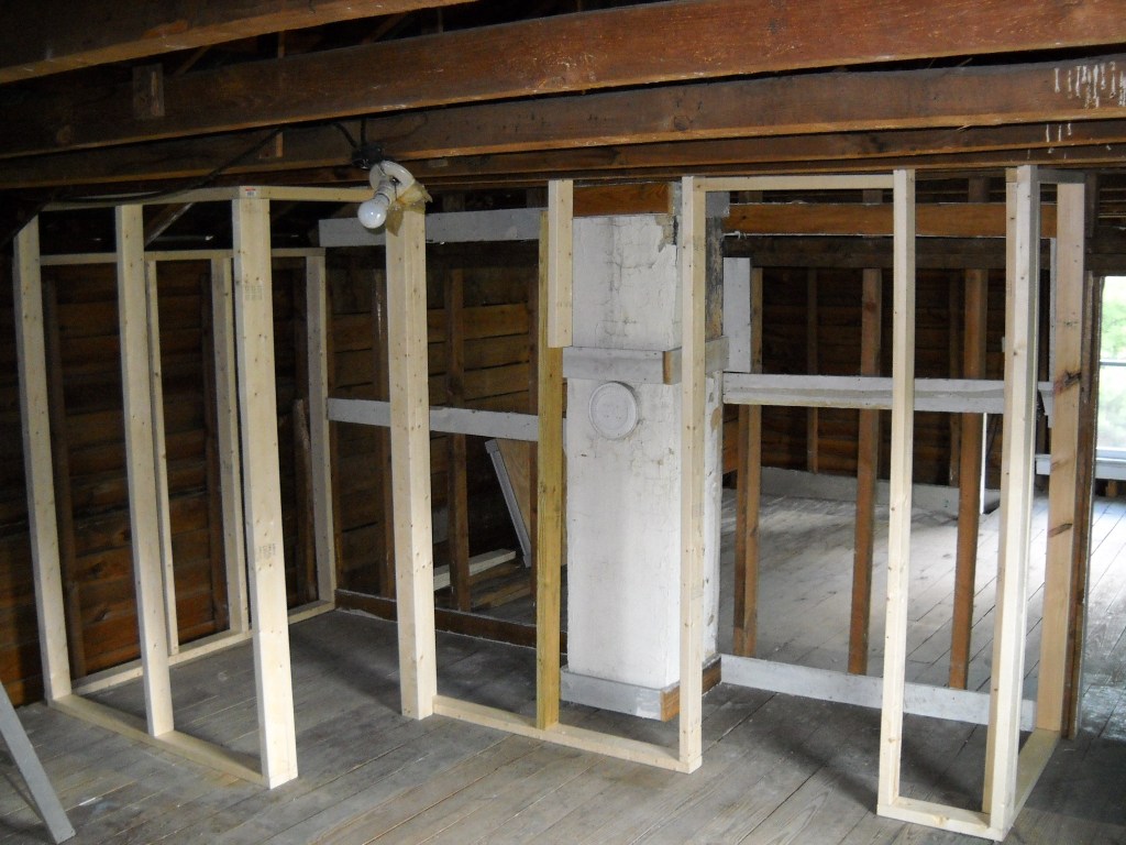 The second floor of this 1910 farmhouse is typical of this type of construction. Immediately after going up the stairway, one lands on the first bedroom. There are no doors, neither a landing. There are two rooms and one connects to the other. The entire space upstairs measures 30×15 feet resulting in two 15×15 feet rooms. These are supposed to be bedrooms. They lack the privacy found in modern construction. We set up the first bedroom as an office. This was a necessary room. Before buying the house, I asked the realtor if there was internet available in the area, if not, that would be the deal breaker. Although broadband was not available, other types of connections were. This room was the second to be finished. The floor was in good condition, however, some boards were loose. The walls and ceilings were in bad shape – holes, dirty, mismatched materials … The chimney in the center of both rooms had to be covered, and some wood beams had to be reinforced. There were birds nests, wasps nests, garbage, debris, and even vines growing inside. As any other room in this old house, it required much work.
