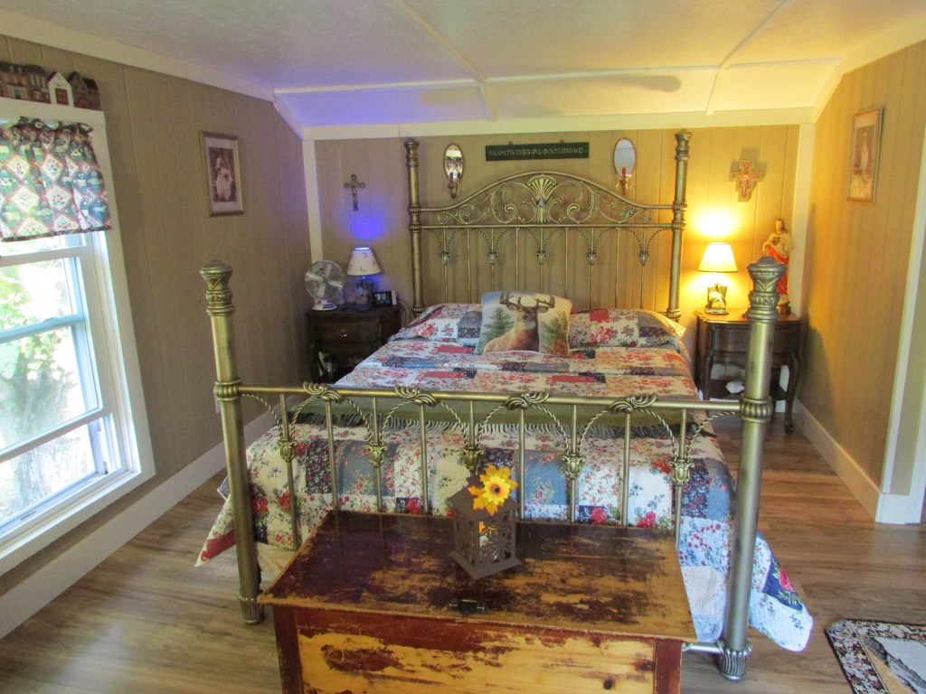 The bedroom was the first room we fixed. Like the rest of the house, it was in very bad shape and required work. The walls had significant damage as well as the ceiling. The floor had some minor issues but we decided to install laminate flooring due to the uneven space between boards, some discoloration, and other minor issues, something quite normal. The room is 15 x 15 feet and it has two floor to ceiling windows due to the low ceiling (seven feet or so). The house does not have any closets, except for the one in the living room, something common for this type of construction. The room had a makeshift shell of a closet that was falling to the side, kind of hanging there with no support. We thought about using vintage his and her armoires but settled on the idea of building a walk-in closet around the chimney space, which worked out great. The chimney was in rough shape and had to be covered anyway so the space was ideal for it. I thought that building the closet would rob the room of space but it worked out well; we don’t miss the space and it was a much needed use of it. Because this was the room at the far end, we knew that it would be the coldest room. The pellet stove does a great job at heating the house, however, we decided that adding an electric fireplace on a corner would be a good idea, just in case we needed extra heat on a cold winter. This arrangement has worked fine.