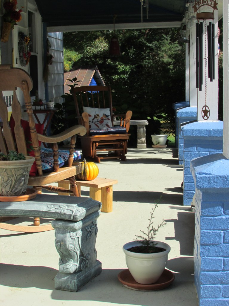 The porch ceiling needs to be repainted eventually. The cement floor needs to be tiled to prevent further deterioration. Right now, it is cement that we fixed, patched, and painted. Ideally, I would like to place slate tile or brick on top.