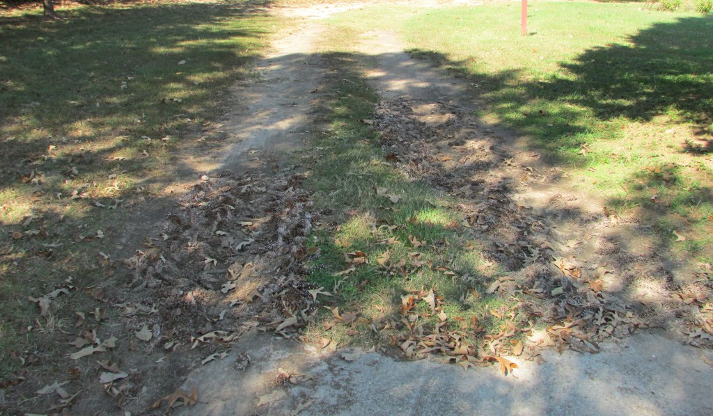 Another item on our list of outdoor “must handle” issues is the driveway. Over time, the soil changes. When it rains the driveway becomes very muddy with two large areas that retain water. A couple loads of gravel should take care of the issue. For now, we have been collecting pinecones and pine needles from the property and placing them in the problem area. It works temporarily. In addition, we have to patch the old cement part that was uncovered.