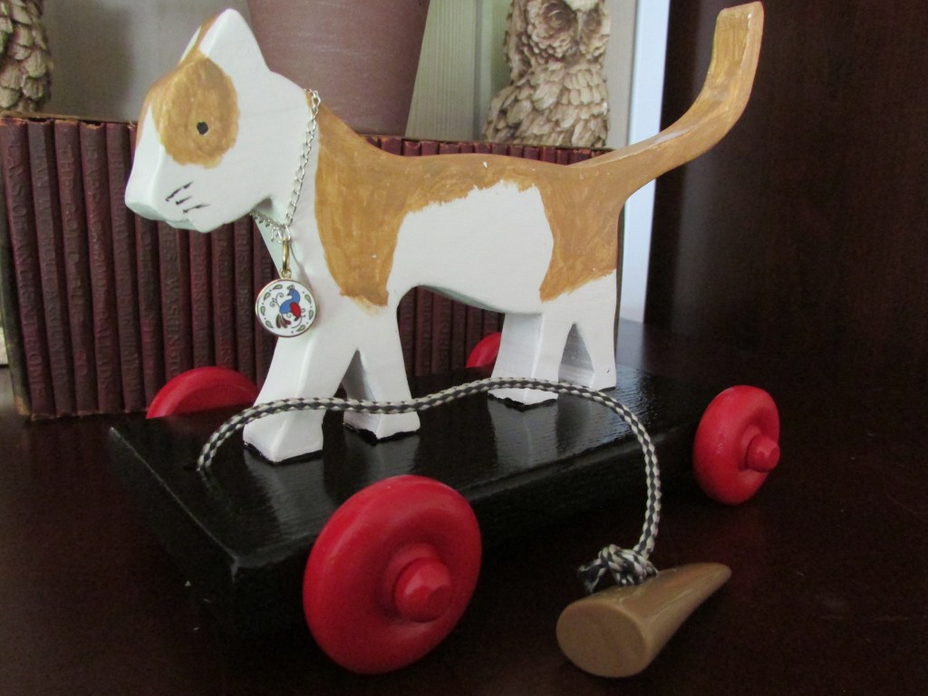 From time to time, my husband will make a wooden piece reminiscent of old days gone, when things seemed simpler, and things were handmade. It ends up on our shop – The Owl, Book & Candle. He loves working with wood; I think it is his call, although he loves everything about cars as well. His pieces are truly handmade. Over the weekend, he made this adorable pull toy, a kitty cat that he painted like one of our cats. All materials for this piece are recycled, the one thing that we try to do with most of our pieces. I am liking this one very much. When he retires, I can visualize him tinkering with pieces of wood and creating an array of lovely pieces reminiscent of yesteryear.