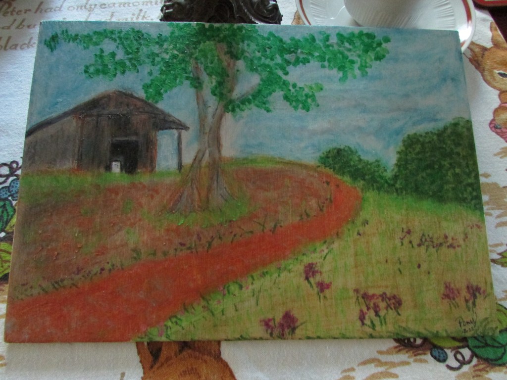 The other day, my sister sent me a picture of the old barn on the farm. I loved the picture and decided to see if I could paint my version of it. I had some oil pastels and a piece of recycled wood that served the purpose. The climb of that hill to the barn is lovely, but the views on the other side are so beautiful. Almost as if this old barn was a silent keeper to the beauty beyond it.