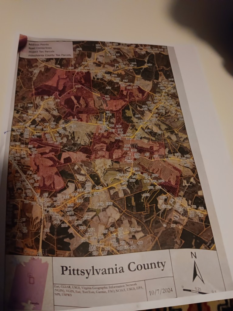 It is with a heavy heart that I write today. My thoughts and prayers have revolved around the issue that is pressing on the heart of the residents of Chatham and Pittsylvania County, VA. It took us by surprise, concealed by a non-disclosure clause on a real estate transaction, the sale of 2200 acres of agricultural land that surrounds our small community. The proposed rezoning of the land from residential and agricultural to heavy Industrial hit our hearts, minds, and souls as a venomous spear at high speed. The company called Balico LLC wants to build a monstrosity of a project that will have severe repercussions in our little farming community. Here is a picture of a flier that shows you the immensity of this project, a heresy, an abomination in my honest opinion. The area in red that surrounds all tax parcels in our community is where an enormous gas-powered power plant (300 mw site) that will be powered directly by the Mountain Valley Pipeline that crosses our area will exist. Besides the 3.5 GW power plant, the project also proposes a switchyard, a wastewater treatment facility, and a substation (in 13 acres reserved for those), but also 84 large data centers (numbers keep changing between 70-84 depending on the news source, whether70 or 84, it is one too many) that will each one measure 394,000 sf by 40 feet tall approximately. This will all be built around our community, some residents having it next door, while others, like me, will be smacked right in the center of it, surrounded by it on all sides. Mitsubishi turbines will be used according to the developer. I think the power plant will also include 9 gigantic towers that will expel smoke into the air. As you can see in the map, hell is colored in red. The developer thinks that this project will benefit the community and provide many jobs, which I doubt because it will mostly be run by computers. The construction of this monstrosity will take around 10 years or so of disruption to this community, the pain before the pain.