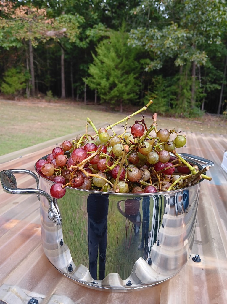 A nice start to the season that I have been waiting for a few years now has finally materialized, and that is the harvesting of grapes from our one and only grape vine. For me, this is significant because I bought the lonely plant at Aldi’s at half price and almost dead. I just wanted to give it a chance. I planted it and it took well. The first year it just grew and spread its branches, the next year a few single grapes showed up but nothing to hope for, and on the third year a significant number of grapes hung from its large and steady branches; however, as they grew and matured approaching harvest time, all grapes disappeared overnight. I blamed deer but we had a fence. My neighbor was disappointed as well because we were waiting to taste the grapes. My husband and I decided to trim the plant all the way and retrained it to get it away from the fence. That meant another year without grapes. This year, I could see all the grapes, tons of them, and I was fearful that what had happened once would be repeated. I kept tasting them every few weeks to be sure when to pick them, but I missed the perfect timing, after all, it was my first time harvesting grapes. I skipped a few weeks of tasting grapes, and in the process, I lost a ton of them that were ready, many. However, the wasps, bees, and butterflies have been enjoying the mushy grapes, and not all was lost because the vine produced so many grapes that we were still able to collect a wheelbarrow full. We rinsed the grapes three times and kept a large bowl for us and gave the rest to my sister and neighbors.
