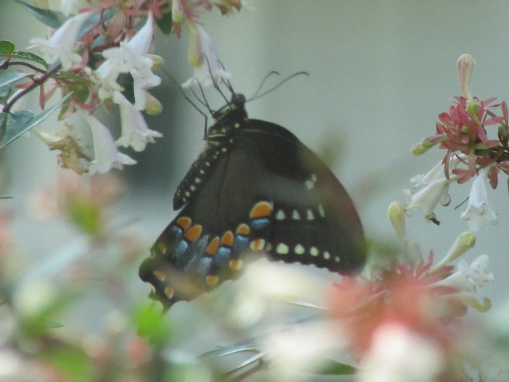 I have been in awe over the last couple of days admiring these ladies (and gentlemen) in my garden. I had been telling my husband that this year I have not seen as many butterflies as other years past. It must be that everything has been so dry from the lack of rain, only a few showers here and there, but no significant amount. Other areas close by have enjoyed more showers. The flowers have withered, some that were ready to bloom as well, and the veggies are growing slow – no tomatoes yet; only four cucumbers made it to the table along with a few leaves of lettuce. If anything, we will have a late harvest. We have been watering every other day, but it does not seem to be enough. Just when my gardening enthusiasm was fading a bit, we were blessed with a couple of short heavy showers overnight, and also the butterflies have been visiting the only source of nectar that has been doing good around here during the season.