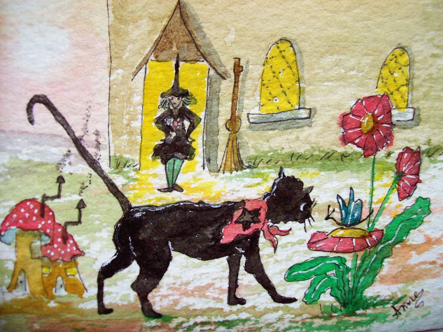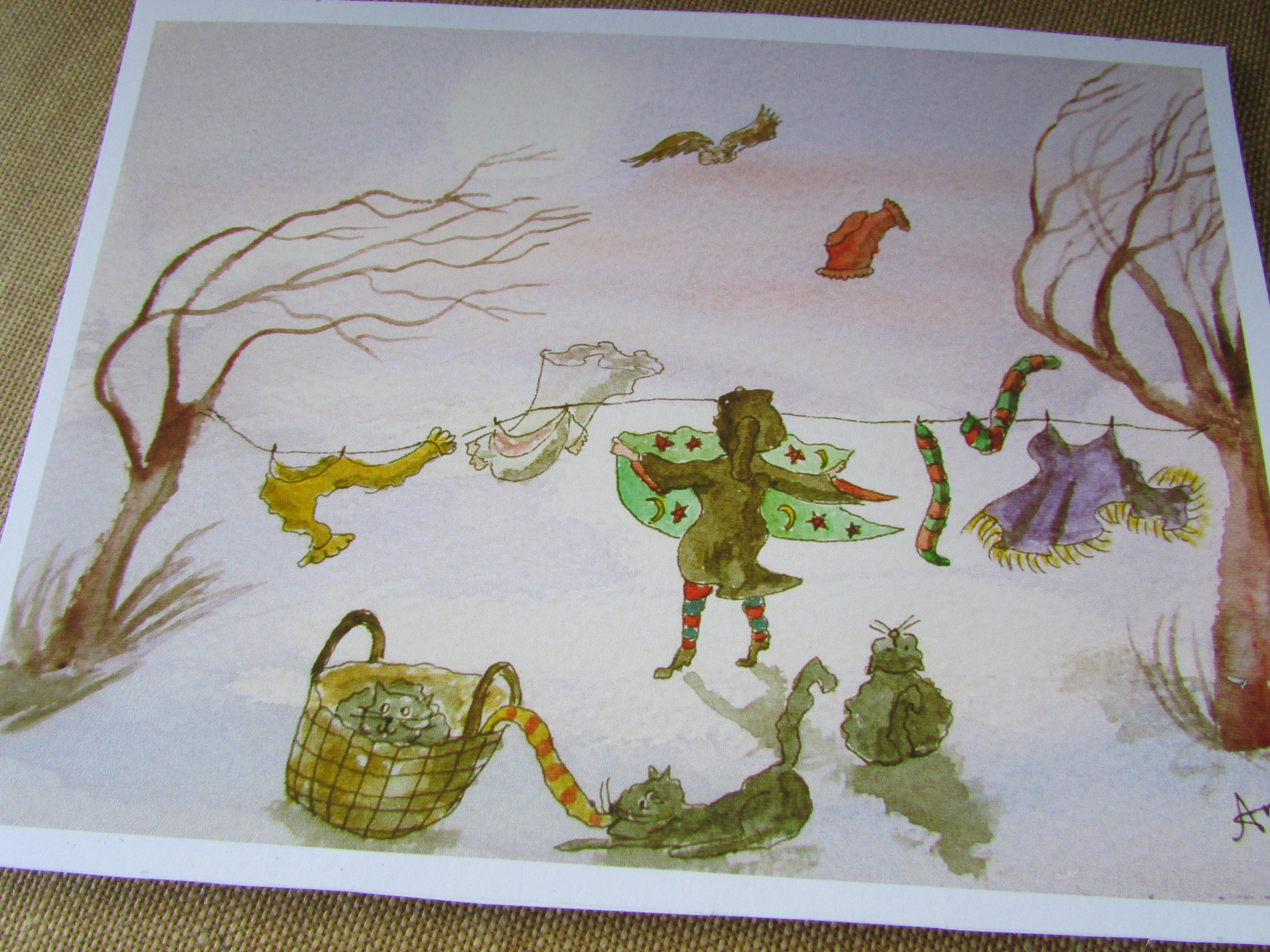 Today I am very happy to dedicate our celebration to a very special Artist – Anne Rymer.  Anne is also the owner of BOOCRAFT, and she resides in Cornwall, UK.  I love her paintings and I have acquired some of them.  Her watercolors are full of magic, happy days, and I totally love the unexpected whimsical details in them, as well as the colors she uses.  One of the things I love about her paintings is that there is always movement in her subjects and landscapes – from cats and witches, to country folk, to seaside and rivers … Her inspiration is the rich history of the lovely Cornwall, a place that seems magical.  Her favorite poem is “Warning” by Jenny Joseph.  Instead of me telling you her story, I will share with you what she has to say,