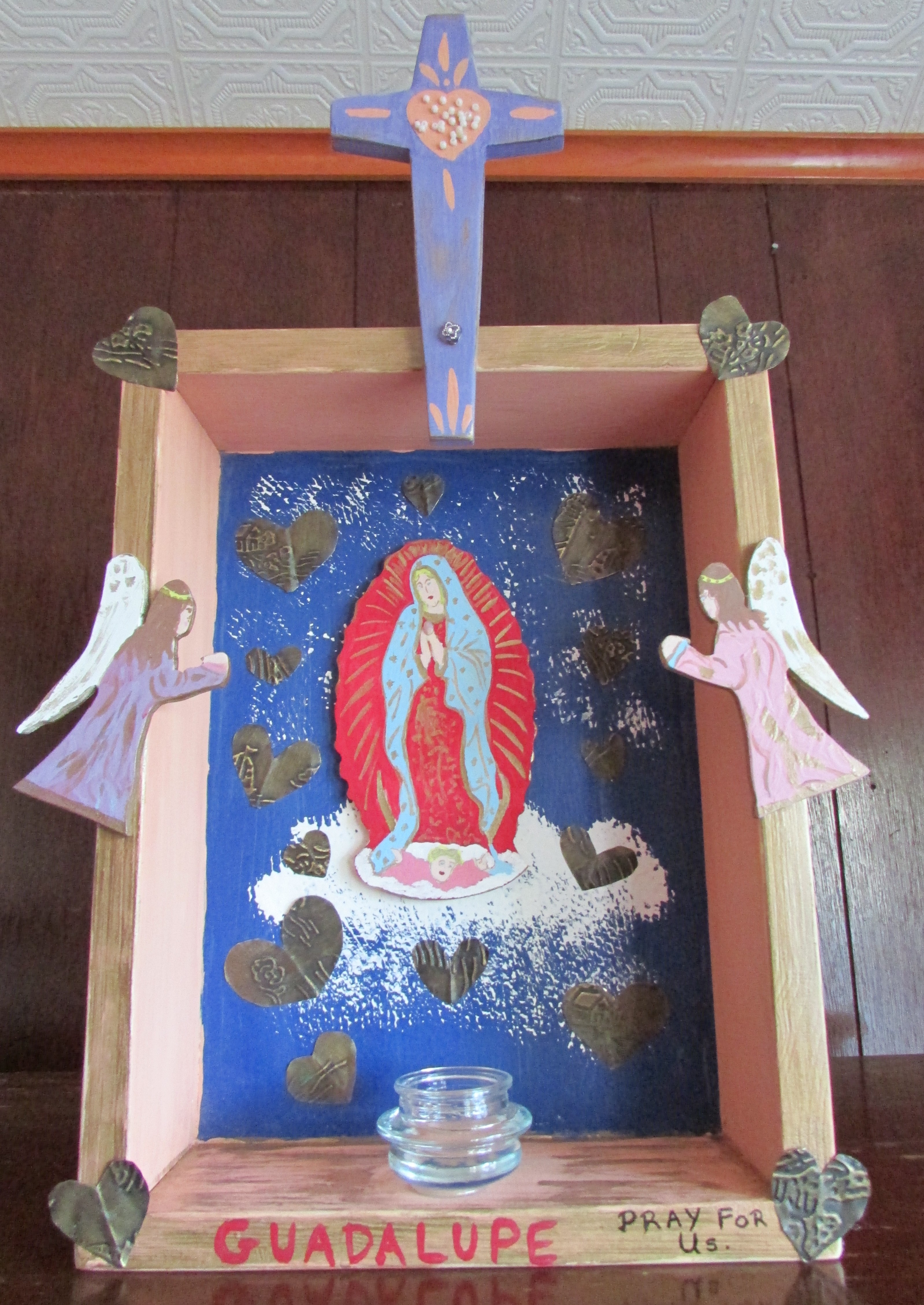 One of the items that I love to recreate is the old retablo, an art that almost disappeared at one time. Retablos are supposed to be made of wood, hand painted, and with a rustic appeal, almost as if the artist worked with the “few materials at hand” reminiscent of the traditions of the populace, the people of faith who made them. Here is one of my Retablos or Nichos (niche) of the Virgin of Guadalupe. I created this sculpture using a variety of mixed materials. I am working on a few other retablos, and designs (I know, I should be writing – but sometimes I need a little break to recharge my batteries). In each of my religious sculptures, I hide a small gemstone, in this case,  a tiny opal. Can you spot it? You might need to use the zoom feature. Here is the photo.