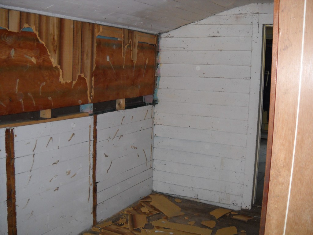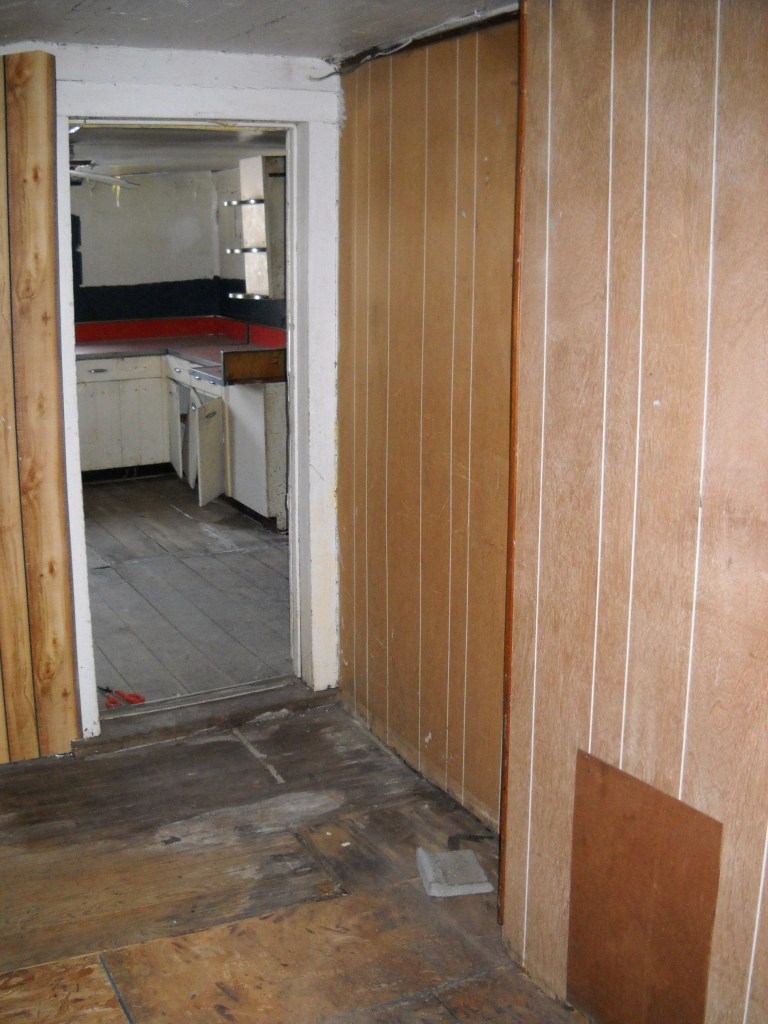 This picture says it all, and it also gives you an idea of the array of materials on the walls – various layers of wallpaper, panel, sheetrock, wood …
