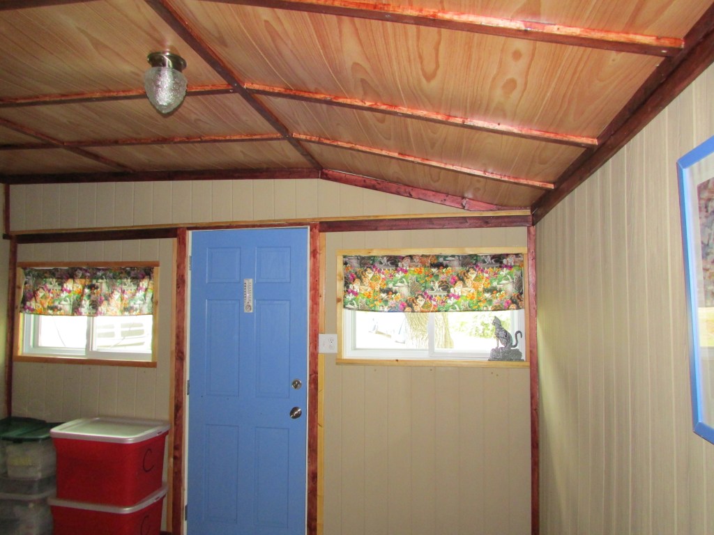Once walls/floors/door/windows were fixed and some cat décor placed. The ceiling had large openings in between boards so we had to seal and cover it.