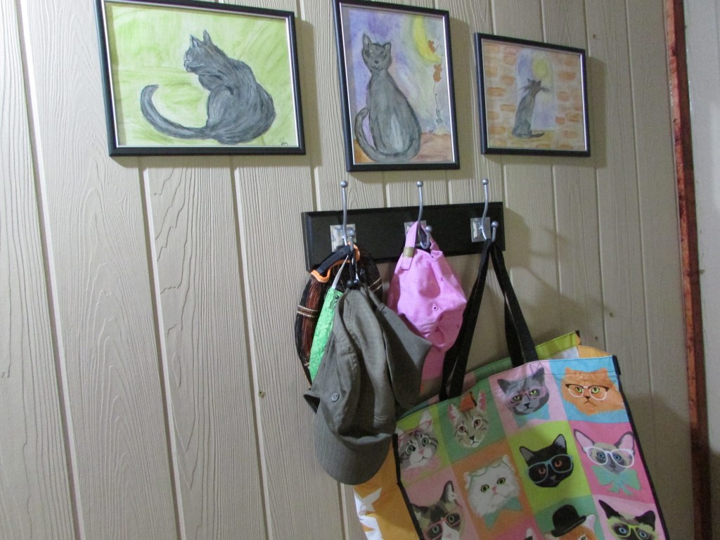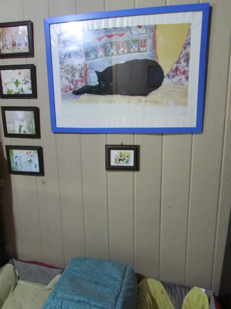 Cat sleeping area. Only one cat uses it. The others prefer the rest of the house. All art is cat related. The smaller framed art is from artist Anne Rymer.