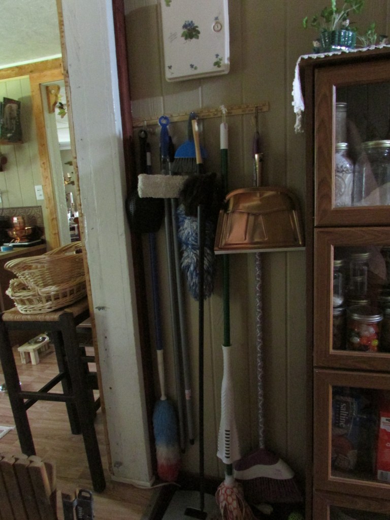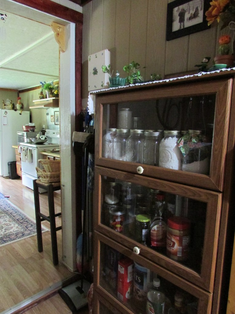 Originally, it was a side/back porch which the previous owners enclosed and converted into a mudroom. I was told that when the former owner (the second owner) became ill and bedridden, the house required an indoor bathroom (it used to have an outhouse – we have no idea where it is). They decided to enclose the porch and use part of the room to build a bathroom. This is the reason why the cat room is shaped like an L. Now this room serves many purposes – first, a room for my cats, where the cat beds, food, toys, litter, and supplies are kept, side entrance, mudroom where we keep coats, rain boots, work boots, hats, cleaning equipment… We moved the water heater to this location; it used to be in the kitchen. The first part adjacent to the kitchen serves as a pantry. It is a generous size room although shaped like an L. It could have served as a dining room as well, but the cats needed their own space too.