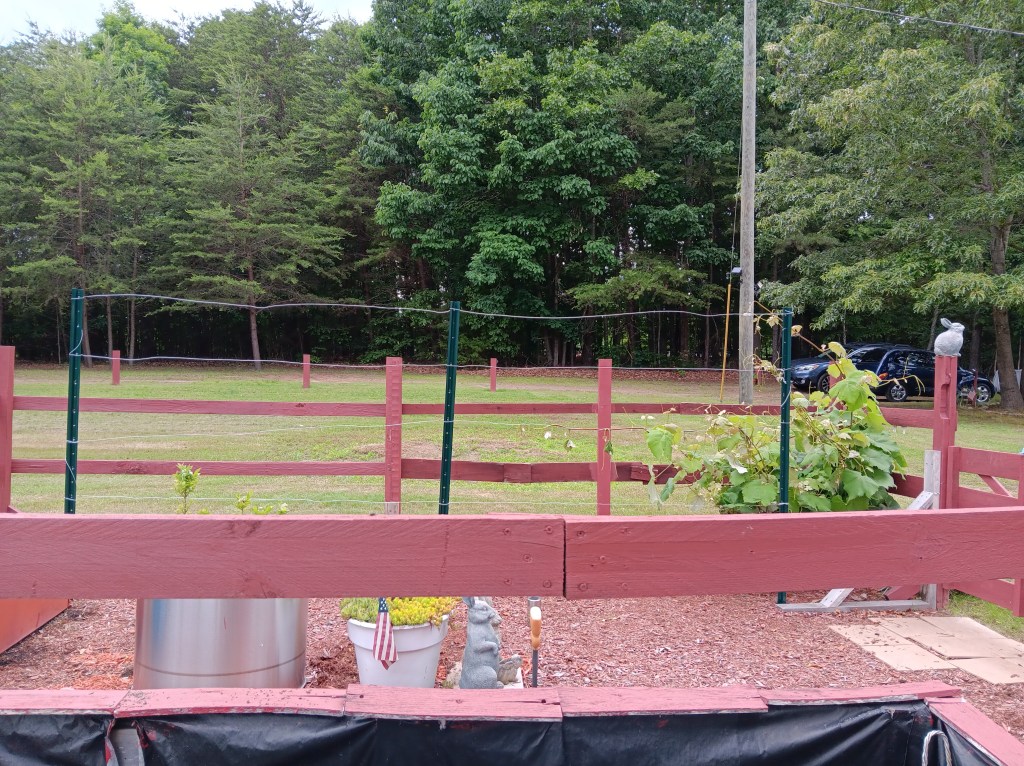 Finally! We have been postponing working on the grape vine project or planting due to some rain. Last weekend we were able to tackle all this. We bought the necessary materials and plants, and now, everything is in place. Last year, deer ate all the grapes because the vine was intertwined on the veggie garden fence and easy to access. We cut and cleaned it up during the winter to see if we could do something that would make the vine a bit less accessible inside the veggie garden. However, the vine started to grow fast again, shooting new growth everywhere, before we could start training it, and the weather did not help. My husband came up with the idea of getting three metal stakes and wire and placing these on the ground inside the veggie garden and making four rows of wire so the vine could grow. It was a quick project and under $50. I don’t know if the deer would be able to reach it or jump the fence; I hope not. This is what it looks like.